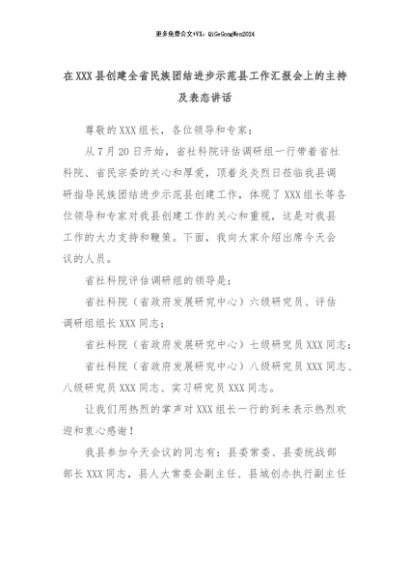 【七哥公文】2024年:在XXX县创建全省民族团结进步示范县工作汇报会上的主持及表态讲话+更多免费公文+VX:QiGeGongWen2024