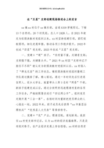 / 【七哥公文】2024年:在“五星”支部创建现场推进会上的发言+更多免费公文+VX:QiGeGongWen2024