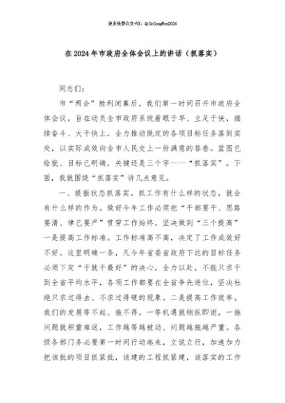 / 【七哥公文】2024年:在2024年市政府全体会议上的讲话(抓落实)+更多免费公文+VX:QiGeGongWen2024