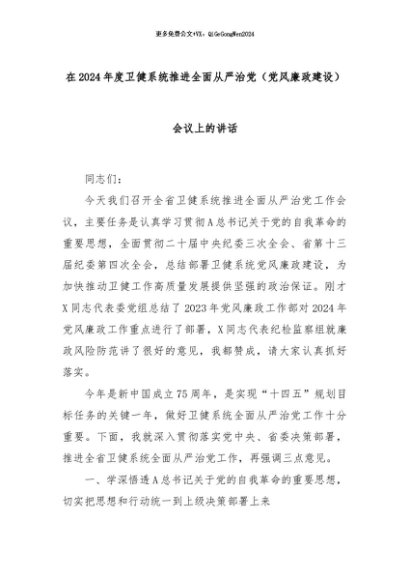 【七哥公文】2024年:在2024年度卫健系统推进全面从严治党(党风廉政建设)会议上的讲话+更多免费公文+VX:QiGeGongWen2024
