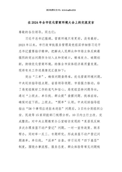 / 【七哥公文】2024年:在2024年全市优化营商环境大会上的交流发言+更多免费公文+VX:QiGeGongWen2024