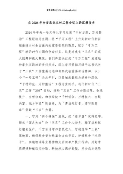 / 【七哥公文】2024年:在2024年全省农业农村工作会议上的汇报发言+更多免费公文+VX:QiGeGongWen2024