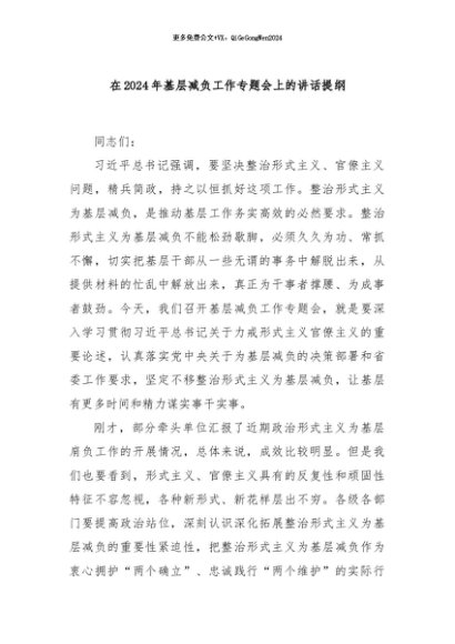 / 【七哥公文】2024年:在2024年基层减负工作专题会上的讲话提纲+更多免费公文+VX:QiGeGongWen2024