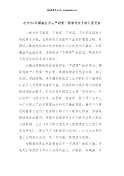 【七哥公文】2024年:在2024年国有企业从严治党工作推进会上的汇报发言+更多免费公文+VX:QiGeGongWen2024