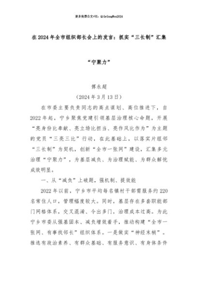 【七哥公文】2024年:在2024年全市组织部长会上的发言:抓实“三长制”汇集“宁聚力”+更多免费公文+VX:QiGeGongWen2024