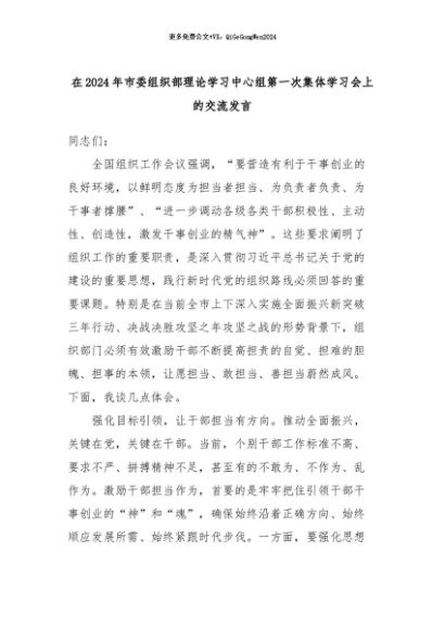 【七哥公文】2024年:在2024年市委组织部理论学习中心组第一次集体学习会上的交流发言+更多免费公文+VX:QiGeGongWen2024