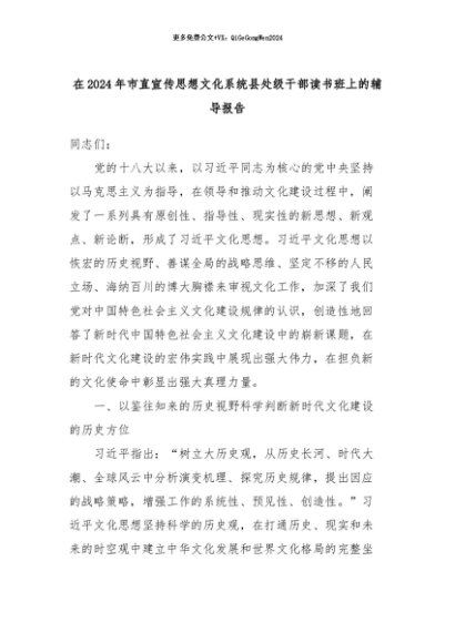 【七哥公文】2024年:在2024年市直宣传思想文化系统县处级干部读书班上的辅导报告+更多免费公文+VX:QiGeGongWen2024