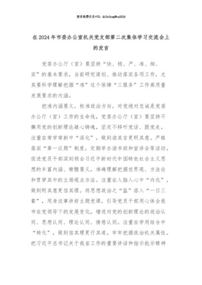 【七哥公文】2024年:在2024年市委办公室机关党支部第二次集体学习交流会上的发言+更多免费公文+VX:QiGeGongWen2024