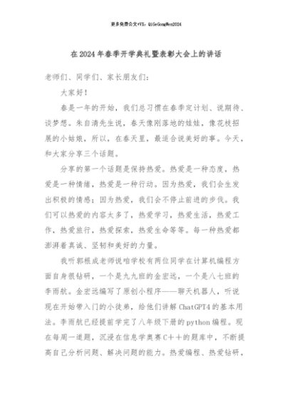 / 【七哥公文】2024年:在2024年春季开学典礼暨表彰大会上的讲话+更多免费公文+VX:QiGeGongWen2024