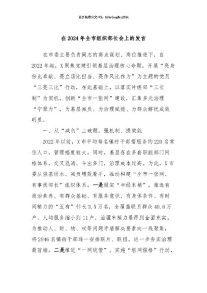 / 【七哥公文】2024年:在2024年全市组织部长会上的发言+更多免费公文+VX:QiGeGongWen2024