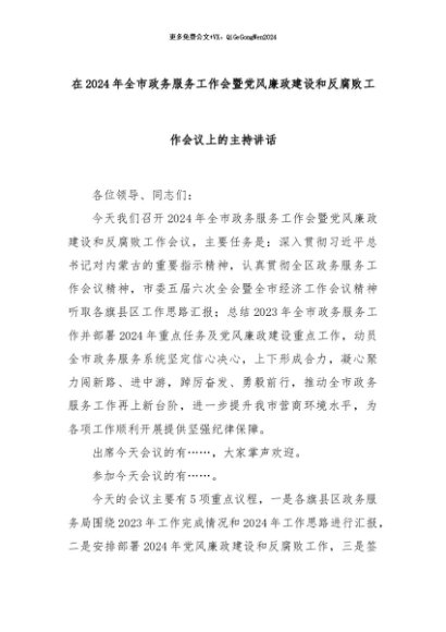 【七哥公文】2024年:在2024年全市政务服务工作会暨党风廉政建设和反腐败工作会议上的主持讲话+更多免费公文+VX:QiGeGongWen2024