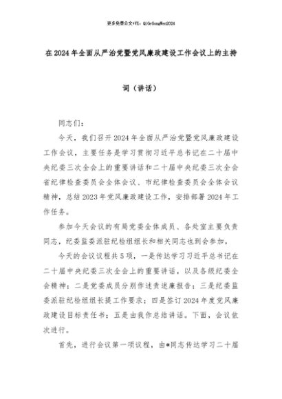 【七哥公文】2024年:在2024年全面从严治党暨党风廉政建设工作会议上的主持词(讲话)+更多免费公文+VX:QiGeGongWen2024