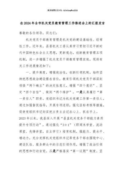 【七哥公文】2024年:在2024年全市机关党员教育管理工作推进会上的汇报发言+更多免费公文+VX:QiGeGongWen2024