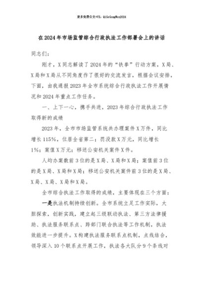 【七哥公文】2024年:在2024年市场监管综合行政执法工作部署会上的讲话+更多免费公文+VX:QiGeGongWen2024