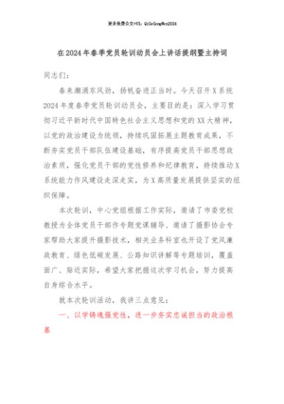 / 【七哥公文】2024年:在2024年春季党员轮训动员会上讲话提纲暨主持词+更多免费公文+VX:QiGeGongWen2024