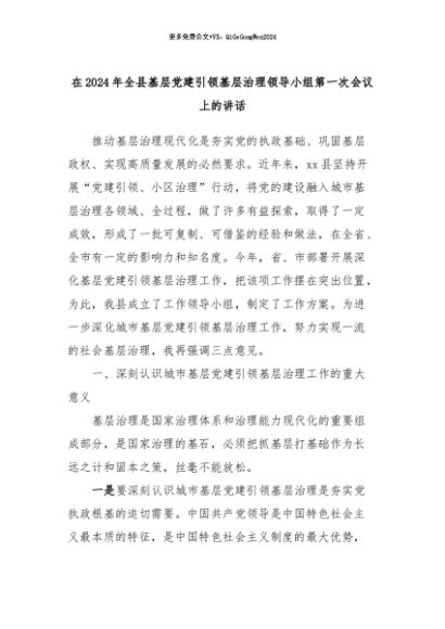 【七哥公文】2024年:在2024年全县基层党建引领基层治理领导小组第一次会议上的讲话+更多免费公文+VX:QiGeGongWen2024