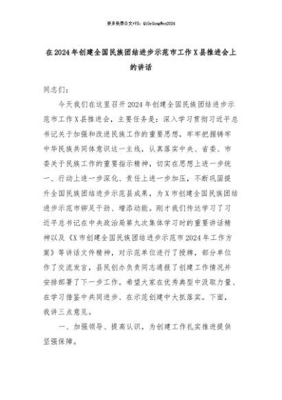 【七哥公文】2024年:在2024年创建全国民族团结进步示范市工作X县推进会上的讲话+更多免费公文+VX:QiGeGongWen2024