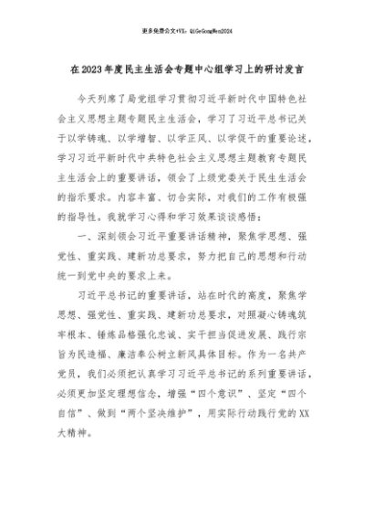 【七哥公文】2024年:在2023年度民主生活会专题中心组学习上的研讨发言+更多免费公文+VX:QiGeGongWen2024