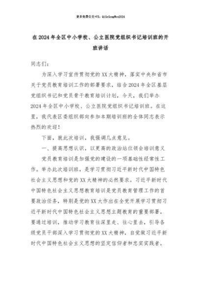 【七哥公文】2024年:在2024年全区中小学校、公立医院党组织书记培训班的开班讲话+更多免费公文+VX:QiGeGongWen2024