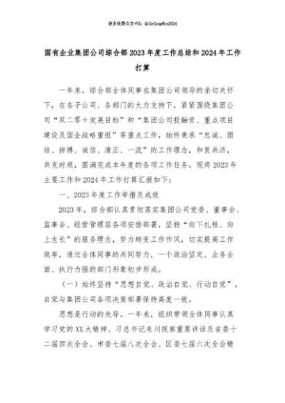 【七哥公文】2024年:国有企业集团公司综合部2023年度工作总结和2024年工作打算+更多免费公文+VX:QiGeGongWen2024