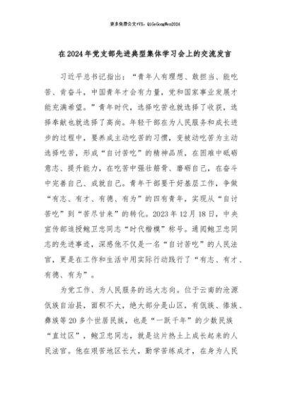 / 【七哥公文】2024年:在2024年党支部先进典型集体学习会上的交流发言+更多免费公文+VX:QiGeGongWen2024