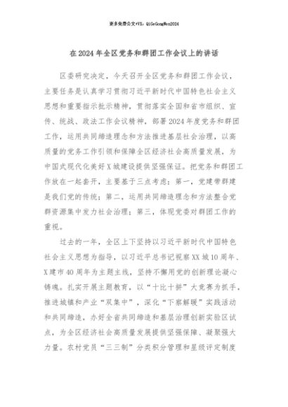 / 【七哥公文】2024年:在2024年全区党务和群团工作会议上的讲话+更多免费公文+VX:QiGeGongWen2024