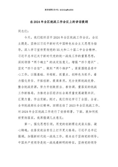/ 【七哥公文】2024年:在2024年全区统战工作会议上的讲话提纲+更多免费公文+VX:QiGeGongWen2024
