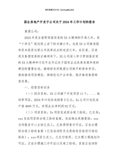 / 【七哥公文】2024年:国企房地产开发子公司关于2024年工作计划的报告+更多免费公文+VX:QiGeGongWen2024