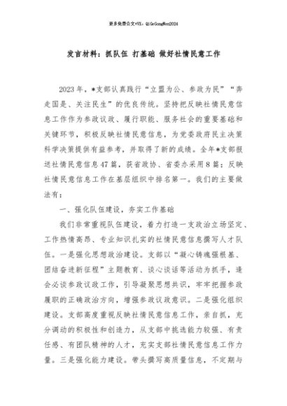 / 【七哥公文】2024年:发言材料:抓队伍 打基础 做好社情民意工作+更多免费公文+VX:QiGeGongWen2024