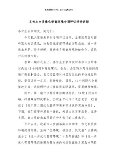/ 【七哥公文】2024年:县长在全县优化营商环境专项评议活动讲话+更多免费公文+VX:QiGeGongWen2024