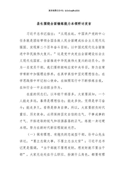 / 【七哥公文】2024年:县长围绕全面锤炼能力本领研讨发言+更多免费公文+VX:QiGeGongWen2024