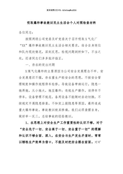 / 【七哥公文】2024年:吸取爆炸事故教训民主生活会个人对照检查材料+更多免费公文+VX:QiGeGongWen2024