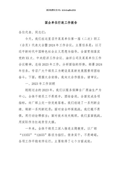 / 【七哥公文】2024年:国企单位行政工作报告+更多免费公文+VX:QiGeGongWen2024