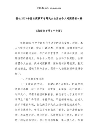 【七哥公文】2024年:县长2023年度主题教育专题民主生活会个人对照检查材料(践行宗旨等6个方面)+更多免费公文+VX:QiGeGongWen2024
