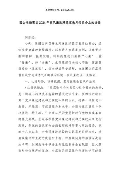 【七哥公文】2024年:国企总经理在2024年党风廉政建设宣教月动员会上的讲话+更多免费公文+VX:QiGeGongWen2024