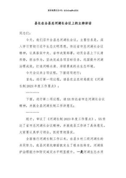 / 【七哥公文】2024年:县长在全县总河湖长会议上的主持讲话+更多免费公文+VX:QiGeGongWen2024