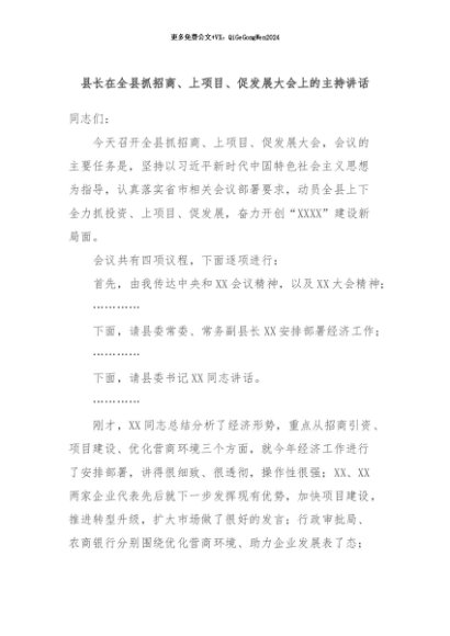 / 【七哥公文】2024年:县长在全县抓招商、上项目、促发展大会上的主持讲话+更多免费公文+VX:QiGeGongWen2024