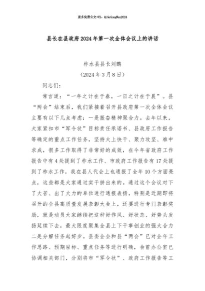 / 【七哥公文】2024年:县长在县政府2024年第一次全体会议上的讲话+更多免费公文+VX:QiGeGongWen2024