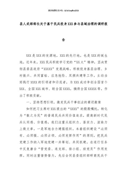 【七哥公文】2024年:县人武部部长关于基干民兵投身XXX参与县域治理的调研报告+更多免费公文+VX:QiGeGongWen2024