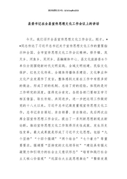 / 【七哥公文】2024年:县委书记在全县宣传思想文化工作会议上的讲话+更多免费公文+VX:QiGeGongWen2024