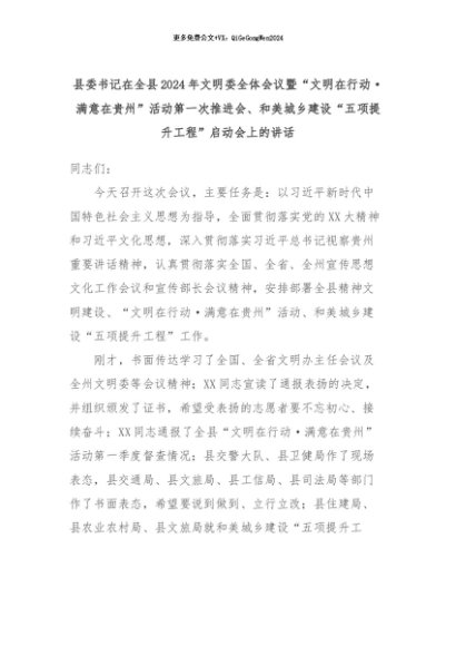 【七哥公文】2024年:县委书记在全县2024年文明委全体会议暨“文明在行动·满意在贵州”活动第一次推进会、和美城乡建设“五项提升工程”启动会上的讲话+更多免费公文+VX:QiGeGongWen2024
