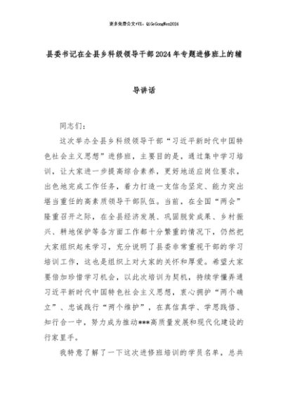 【七哥公文】2024年:县委书记在全县乡科级领导干部2024年专题进修班上的辅导讲话+更多免费公文+VX:QiGeGongWen2024
