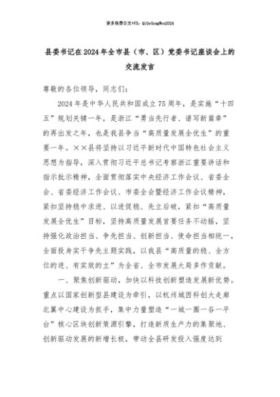 【七哥公文】2024年:县委书记在2024年全市县(市、区)党委书记座谈会上的交流发言+更多免费公文+VX:QiGeGongWen2024