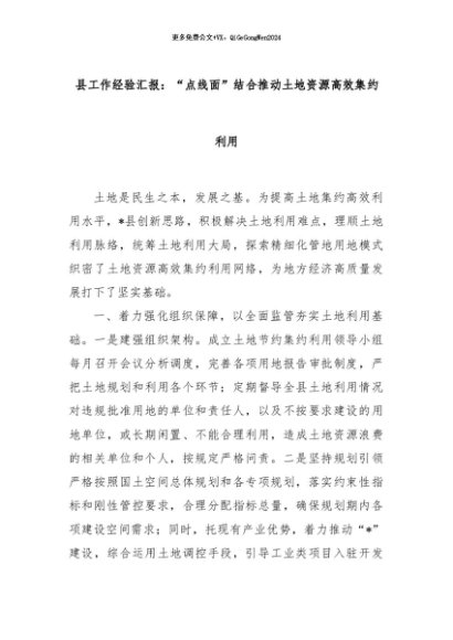 【七哥公文】2024年:县工作经验汇报:“点线面”结合推动土地资源高效集约利用+更多免费公文+VX:QiGeGongWen2024