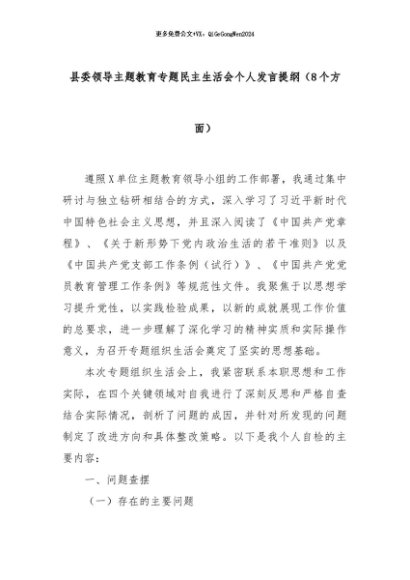 【七哥公文】2024年:县委领导主题教育专题民主生活会个人发言提纲(8个方面)+更多免费公文+VX:QiGeGongWen2024