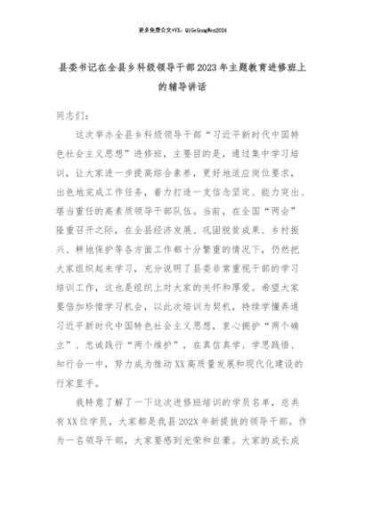 【七哥公文】2024年:县委书记在全县乡科级领导干部2023年主题教育进修班上的辅导讲话+更多免费公文+VX:QiGeGongWen2024
