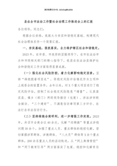/ 【七哥公文】2024年:县在全市法治工作暨社会治理工作推进会上的汇报+更多免费公文+VX:QiGeGongWen2024