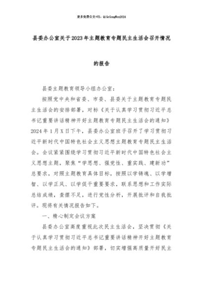 【七哥公文】2024年:县委办公室关于2023年主题教育专题民主生活会召开情况的报告+更多免费公文+VX:QiGeGongWen2024