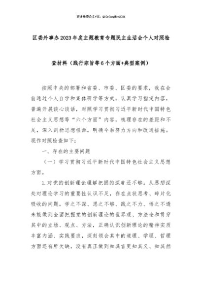 【七哥公文】2024年:区委外事办2023年度主题教育专题民主生活会个人对照检查材料(践行宗旨等6个方面+典型案例)+更多免费公文+VX:QiGeGongWen2024