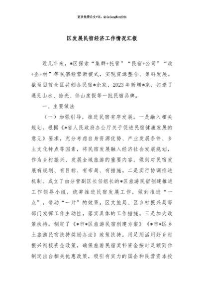 / 【七哥公文】2024年:区发展民宿经济工作情况汇报+更多免费公文+VX:QiGeGongWen2024